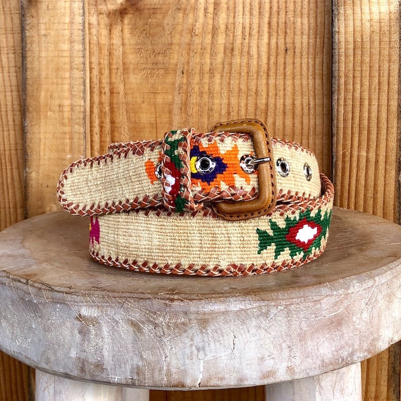 Ceinture artisanale en cuir et coton tissé.